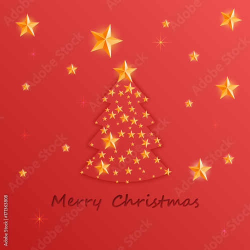 Christmas and New Years red background with Christmas Tree made of cutout paper stars.