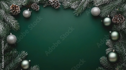 Christmas background with a green color and silver decorations on the edges.