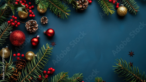 christmas background with branches and balls with space for text