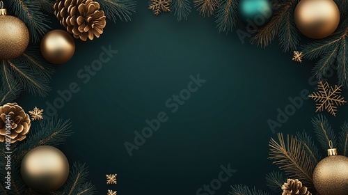 Christmas background with pine branches, golden and teal Christmas ornaments on a dark green background