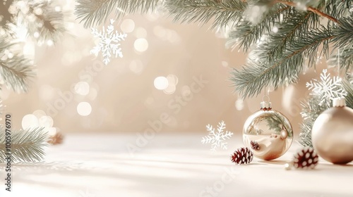 Christmas background with snow-covered pine branches, golden ornaments, red bells, and snowflakes, Ai Generation