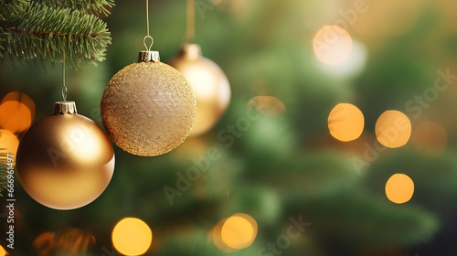 Christmas balls hanging on the Christmas tree, with fir branches and lights in the background, with empty copy space
