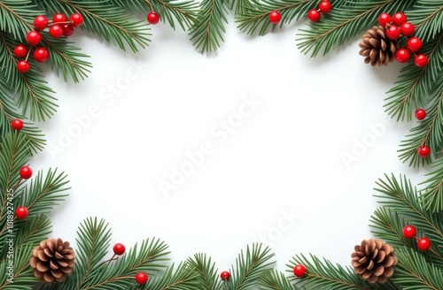 Christmas Border frame of tree branches red berries and pine cones