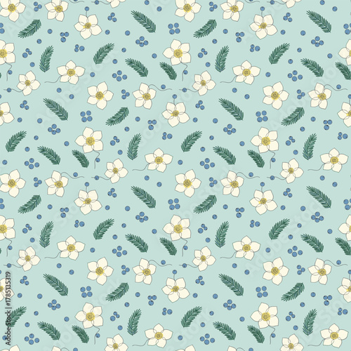 Christmas Botanical Vector. Seamless Pattern Hellebore with Branches and Berries. Winter Seamless Pattern Background.