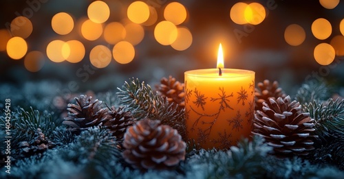 Christmas Candle Scene with Pine Cones and Evergreen for Cozy Winter Greeting Card