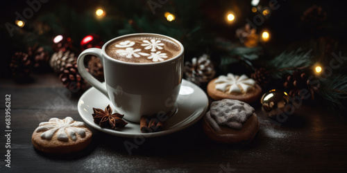 Christmas Coffee. Cup of Coffee or Cappuccino with foam and Christmas Cookies and Christmas Tree Branches with lights on a wooden table. Christmas Dessert