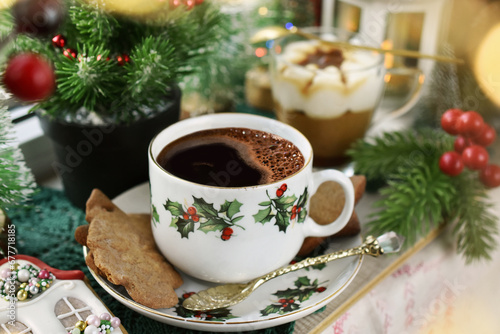 Christmas coffee gingerbread cookies and tiramisu dessert on windowsill