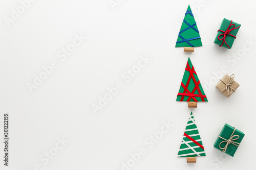 Christmas composition. Christmas tree gift top view background with copy space for your text. Flat lay.