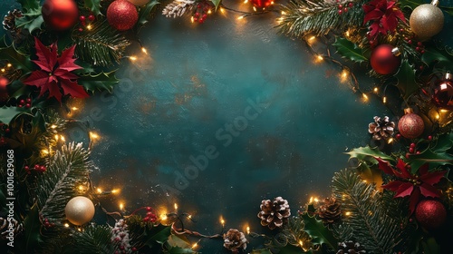 Christmas decor with ornaments and lights on a textured teal background.