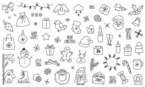 Christmas doodle icon set isolated on white. Winter hand drawn season elements and lettering for card, scrapbook, poster, invitation, sticker. Vector illustration