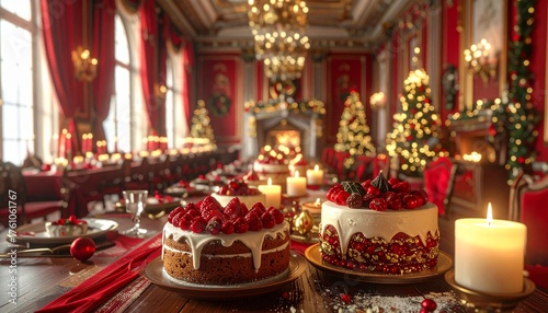 Christmas Eve atmosphere with warm red and gold decorations, Christmas cake on a long table