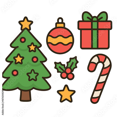 Christmas flat icon set. featuring tree, ornament, gift, holly, star, and candy cane symbols