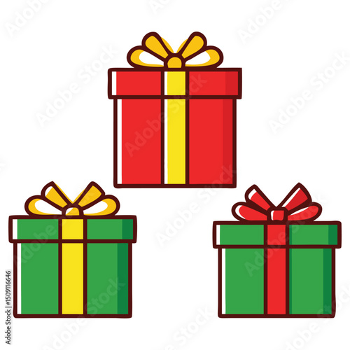 Christmas Gift Box Icons in Solid Outline and Flat Styles with Red Green Wraps and Golden Ribbons