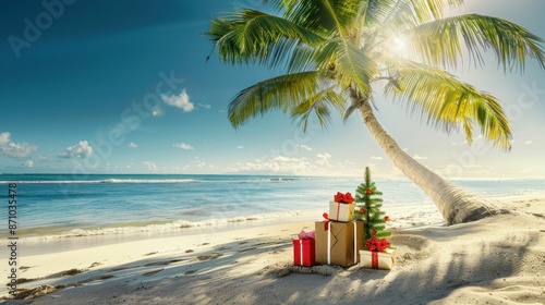 Christmas Gifts Under a Decorated Palm Tree on a Sunny Beach. Generative ai.