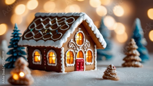 Christmas gingerbread house decoration on light background of defocused golden lights. Hand decorated. The windows are lit up