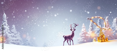 Christmas greeting card or banner design with santas reindeer and snowy tree decoration, Copy space
