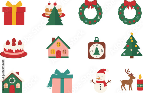 Christmas icon grid, festive decorations, holiday symbols, gift boxes, wreaths, cakes, snowman, reindeer, winter celebration, white background design