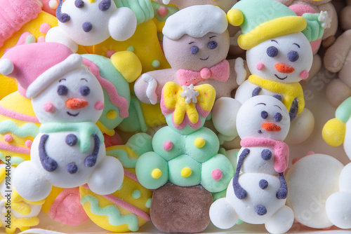 Christmas marshmallows. Winter candy. Sweet food in december. Snowman and Santa Claus