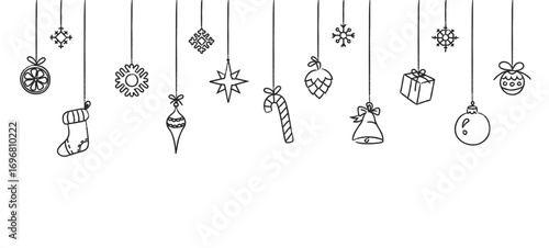 Christmas ornament doodles. Hand drawn hanging xmas snowflakes, candy cane, gift box, pine cone, star and bell holiday decorations on strings. New Year celebration vector illustration.