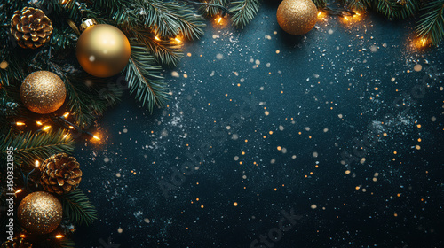 Christmas ornaments and pine cones with golden lights creating magical holiday border on dark blue sparkly background