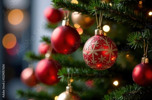 Christmas ornaments on a beautifully decorated tree for the festive season