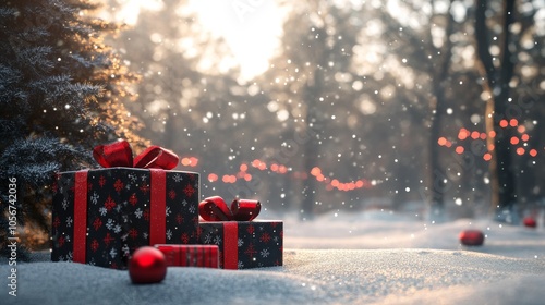 Christmas Presents Under a Snowy Pine Tree in a Winter Forest