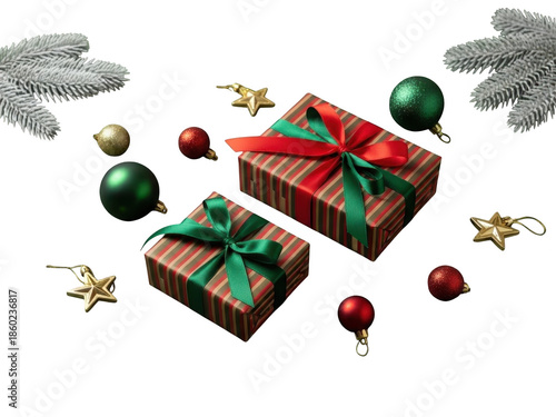 Christmas presents with green and red ribbons surrounded by ornaments and stars on transparent background