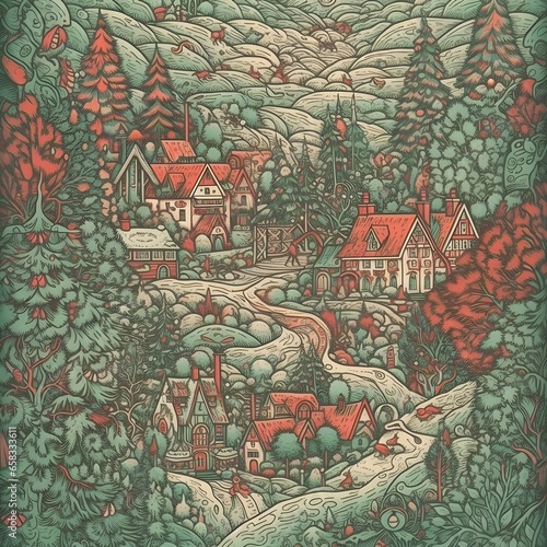 christmas scene red and green village snowed landscape