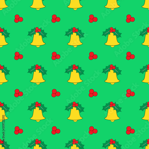 Christmas seamless pattern. Festive bell with a branch of holly on a green background.