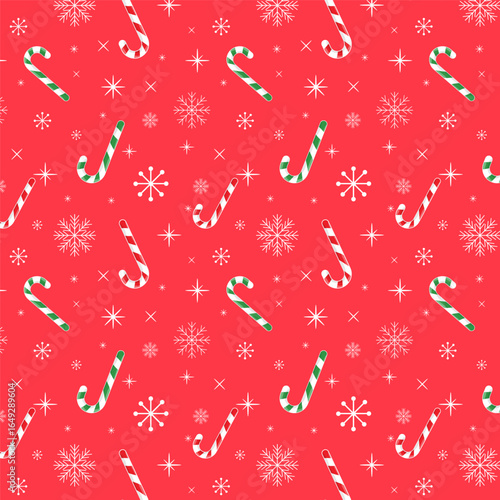 Christmas seamless pattern with snowflakes.Winter snowflake and candy canes on red background.Snow repeat pattern.Vector graphic illustration new year background.