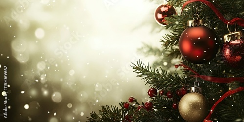 Christmas themed background with blurred golden bokeh lights on the left, decorated pine tree with red and gold ornaments on the right