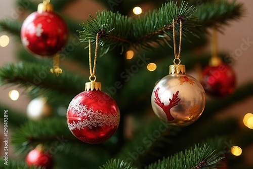 Christmas tree branch with hanging red and gold baubles