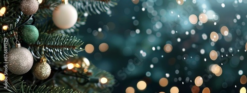 Christmas tree branches with blurred bokeh background and space for text. New Year card template. Christmas card template. Border, winter poster for invitations