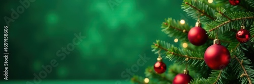 Christmas tree branches with red ornaments & gift Green background, copy space , tree, holiday