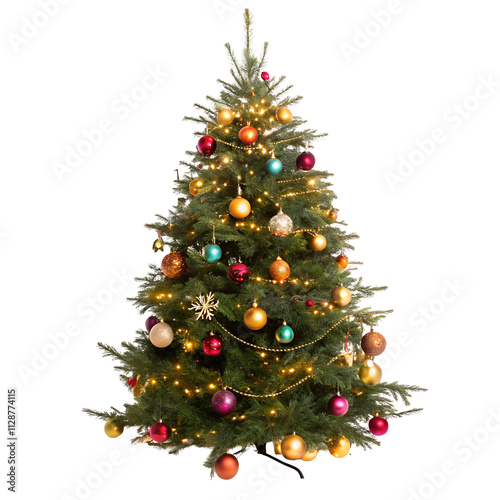 Christmas tree decorated with ornaments and festive lights isolated on white background