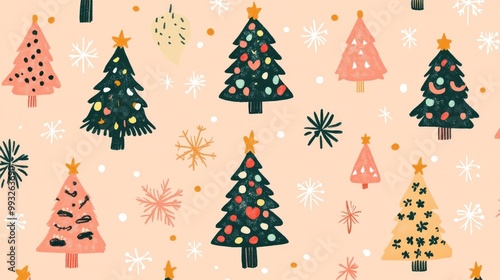 Christmas Tree Surrounded by Cute Kawaii Cartoon Characters, Colorful Monster Pattern Design