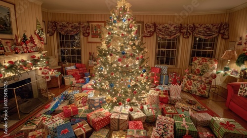 Christmas tree surrounded with gifts, Christmas festival concept