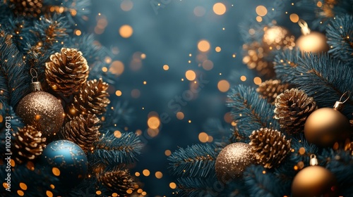 Christmas tree with blue and golden baubles and lights bokeh background. Space for text. Copy space. Greeting card.