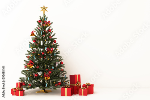 Christmas tree with decorations and gift boxes. 3d rendering