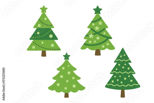 Christmas trees set and collection for winter holiday season celebrating, decorating with stars, baubles, garlands, transparent background