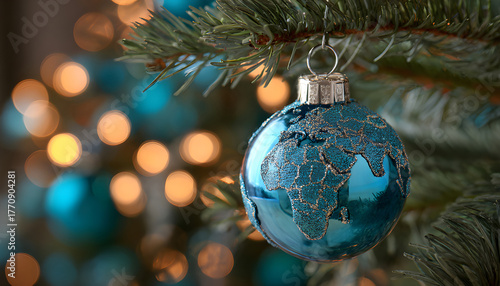 Christmas World Map Globe Ornament Ball in Blue Colors Banner