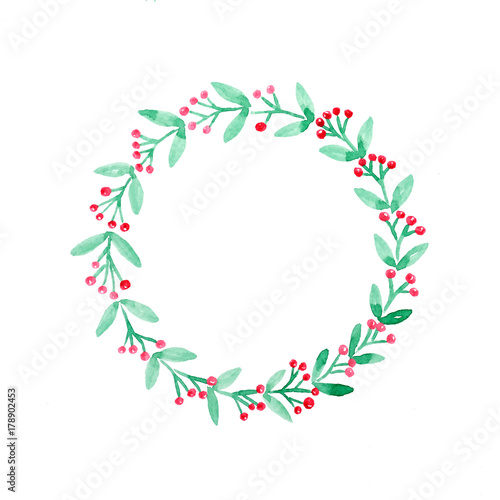 Christmas wreath watercolor drawing on white paper background, Christmas greeting card background