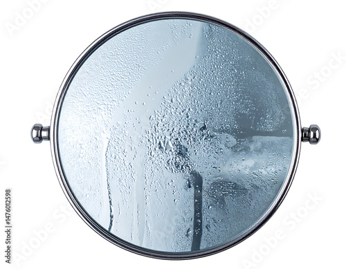 Chrome Framed Circular Mirror Reflecting Blurry Light Blue Image