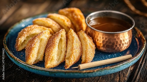 Churro plate featuring golden sliced pastries with cinnamon sugar coating on rustic blue ceramic dish, copper pot of chocolate dipping sauce, wooden stick