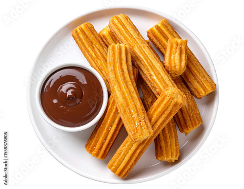 Churros with Sauce Chocolate on Plate, Isolated on Transparent Background, Top View