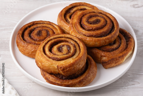 Cinnamon bun in white plate on white table