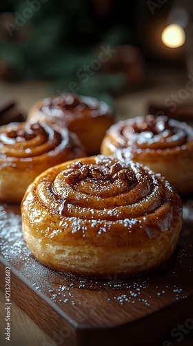 Cinnamon rolls showcased in warm, soft lighting for a cozy appearance