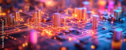Circuit Board Cityscape Futuristic Electronic Micro-Architecture, Tech , Microchips