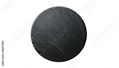 Circular, textured, dark gray slate board isolated on a black background, top-down view