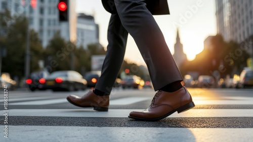 City Commute: Close-up view of a businessman's legs and brown leather shoes as he walks across a city crosswalk during a vibrant sunset. The image conveys a sense of purpose and urban life.